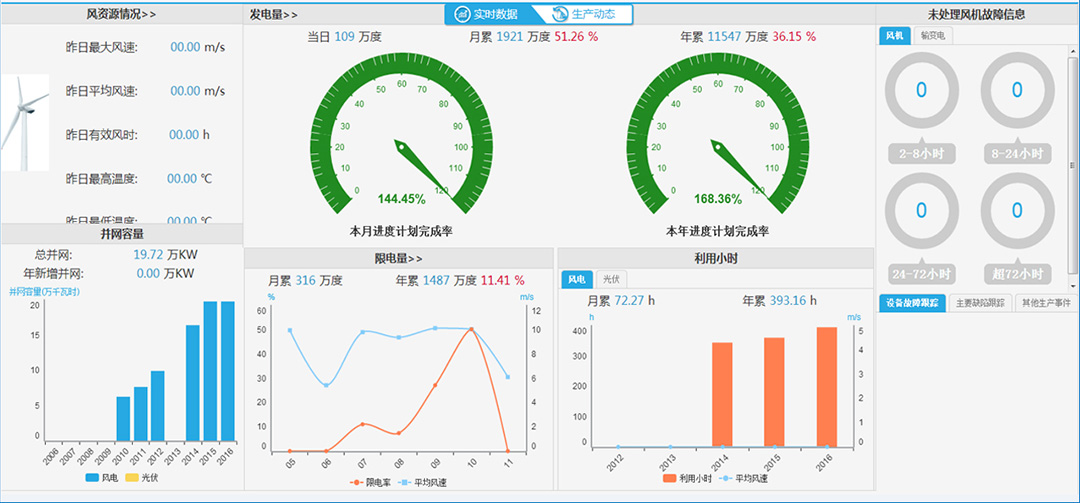 新能源智能管控平臺針對風電、光伏等新能源行業“既集中、又分散”的特點,通過集成風(光)電場分散的各類SCADA系統,結合計算機網絡、物聯網、云資源平臺、大數據等技術,實現風(光)電場設備的遠程集中監控和智能調度;通過生產管理的流程化、標準化和專業化,提升企業生產效率和管理水平,降低生產運營成本,提升經濟效益;利用先進的數據挖掘和并行計算技術對實時數據和業務數據進行進一步的統計分析和專業建模,實現企業的運營監控和績效評估,用真實、準確、全面的數據支撐企業經營的持續優化和健康發展,打造智能、高效的友好型新能源。
