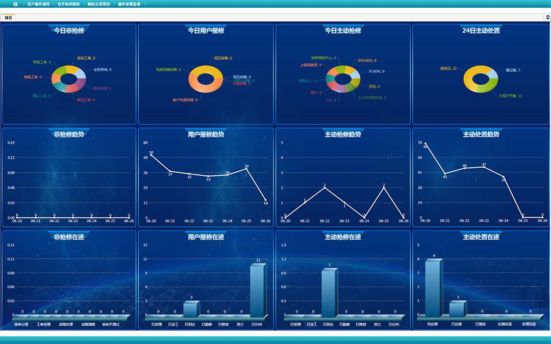 集成營配調各系統業務數據及流程,實現配網搶修指揮業務融合、營銷類與搶修類接單業務融合、配網調度與配網搶修指揮業務融合,促進營配調業務末端融合,支撐集搶修指揮、客戶服務、配網運行監測預警于一體的供電服務指揮中心支撐應用平臺。
